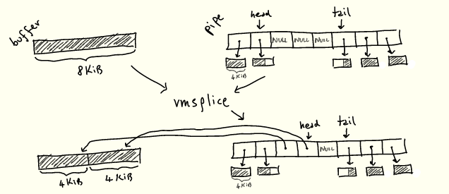 管道大小设置为 128KiB,并且等待 vmsplice 完全输出一个 128KiB 缓冲区,这就保证了当完成一次 vmsplic 迭代时,我们已知前一个缓冲区已被完全读取——否则无法将新的 128KiB 缓冲区完全 vmsplice 到 128KiB 管道中。