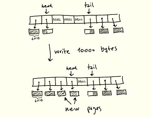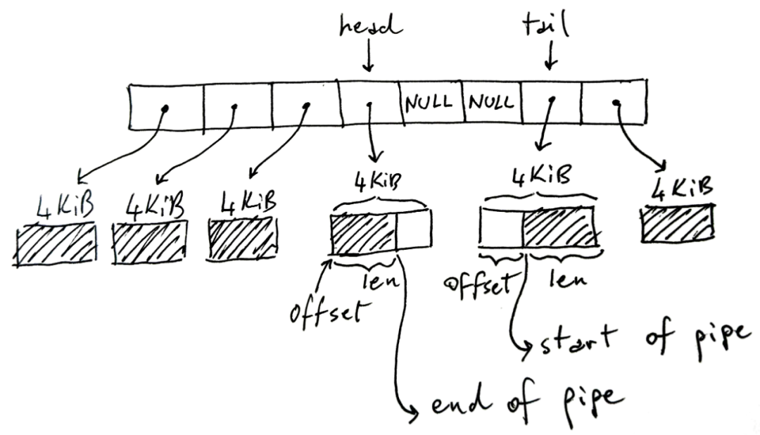 注意,tail 可以出现在 head 之后,如图中所示,因为我们使用的是循环/环形缓冲区。还要注意,当我们没有完全填满管道时,一些槽位可能没有使用——中间的 NULL 单元。如果管道已满(页面中没有NULL和可用空间),write 将被阻塞。如果管道为空(全 NULL),则 read 将被阻塞。