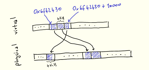 当我们使用它们时,我们的 10k 字节在虚拟内存中看起来是连续的,但将被映射到 3 个不必连续的物理页: