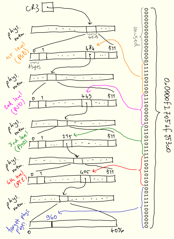 搜索从第一级开始,称为“page global directory”,或 PGD,其物理位置存储在 CR3 中。地址的前 16 位未使用。 我们使用接下来的 9 位 PGD 条目,并向下遍历到第二级“page upper directory”,或 PUD。接下来的9位用于从 PUD 中选择条目。该过程在下面的两个级别上重复,即 PMD(“page middle directory”)和 PTE(“page table entry”)。PTE 告诉我们要查找的实际物理页在哪里,然后我们使用最后12位来查找页内的偏移量。