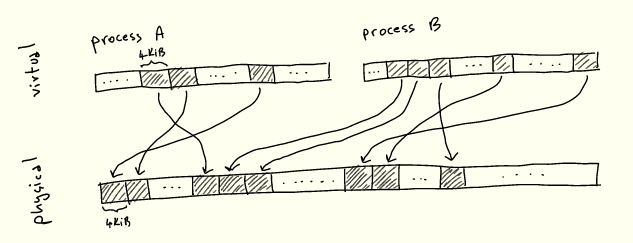 如你所知,进程并不直接引用 RAM 中的位置:而是分配虚拟内存地址,这些地址被解析为物理地址。这种抽象被称为虚拟内存,我们在这里不介绍它的各种优势——但最明显的是,它大大简化了运行多个进程对同一物理内存的竞争。