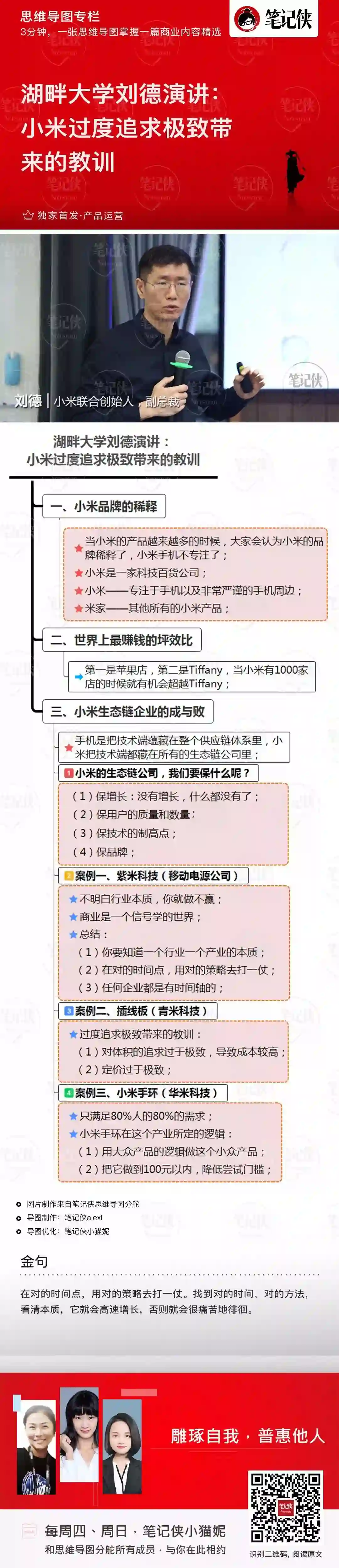 小米的生态链公司要保增长、保用户的质量和数量、保技术的制高点以及保品牌;通过紫米科技的案例,我们要知道一个行业一个产业的本质;通过插线板的案例,我们需要考虑到过度追求极致可能带来的后果;通过小米手环的案例,我们要知道“只满足80%人的80%的需求”的产品逻辑;