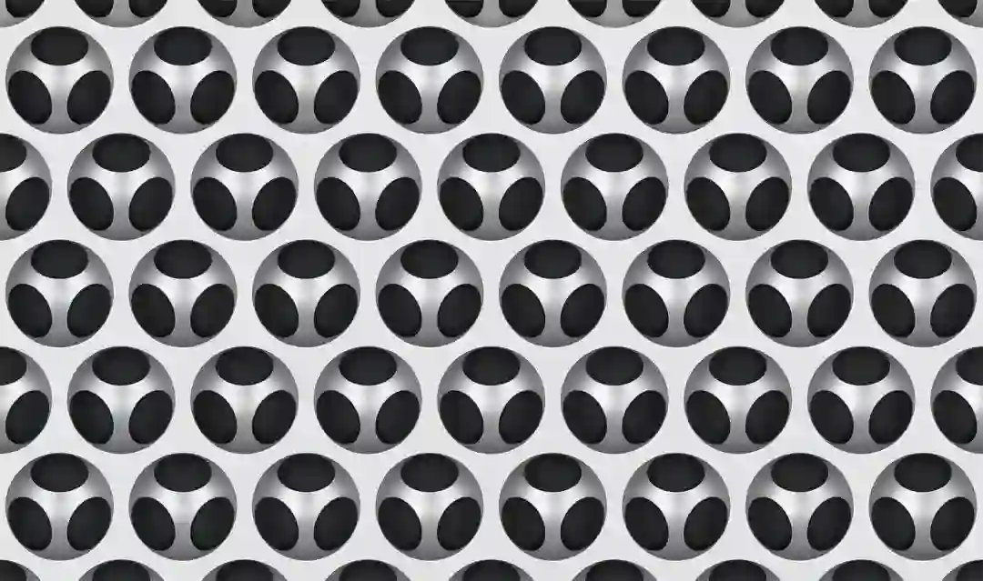 除了内部散热结构的设计以外,Mac Pro 和 Pro Display XDR 那标志性的圆孔网格样式也有利于帮助机器内热量散发(小声bb:真的不是对密恐患者的恶意吗),这种网格样式是根据分子晶体结构的自然状态设计的。三维联锁球面网格增大了表面积,从而提升了通风性能和结构强度。