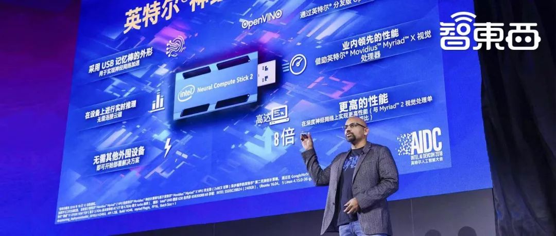会上,Naveen Rao推出了第二代Movidius神经网络计算棒,与上一代相比有着8倍的性能提升。
