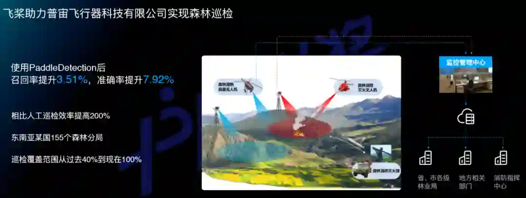 一直以来,PaddleDetection 在产业实践方面有着广泛的应用。在使用 PaddleDetection 替代人工进行森林巡检后,效率提高了 200%;疫情期间,PaddleSeg 应用于肺炎 CT 影像分析 AI 模型,病灶识别的精准度可达到 92%,召回率达 97%,研发工期缩短 30%。