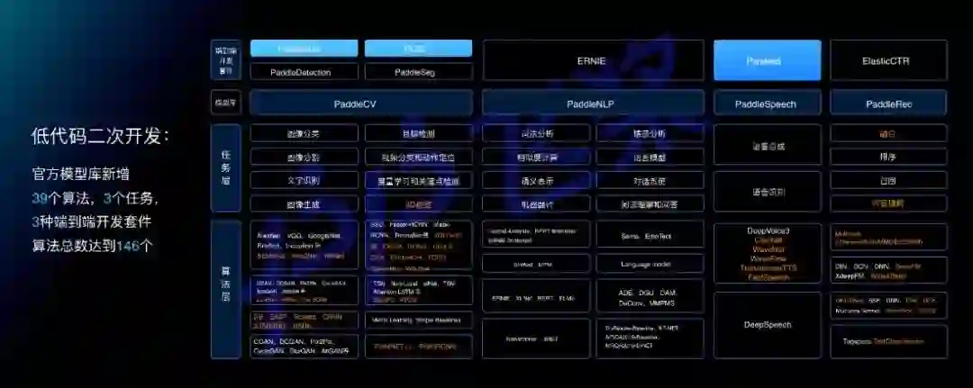 这 7 项新产品包括端到端图像分类开发套件 PaddleClas、端到端语音合成开发套件 Parakeet、前端推理引擎 Paddle.js、开发训练部署全流程开发工具 PaddleX 等。此次,飞桨平台官方模型库新增了 39 个算法、3 个任务、3 种端到端开发套件,方便开发者进行低代码二次开发。