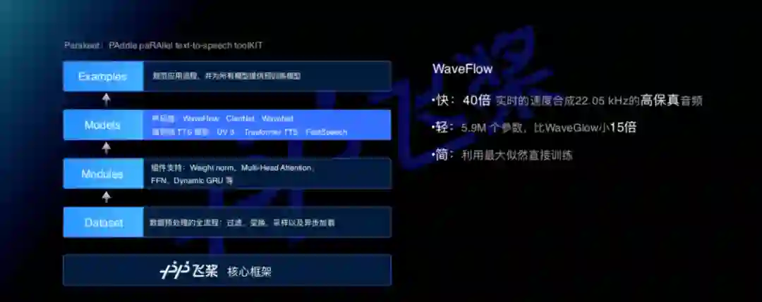Parakeet 是本次飞桨平台全新发布的第二款开发套件。值得注意的是,在模型层,Parakeet 使用了一款百度自研声码器 WaveFlow。