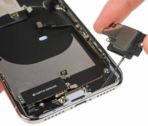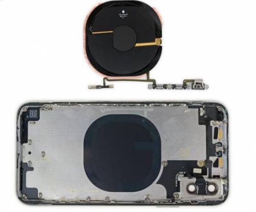 在iPhone X的金属外壳上,我们看到了另一个熟悉的部分:无线充电线圈。当然,还有音量按键、铃声/静音开关和一个未知的传感器支架。