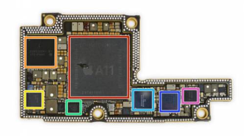 红色:苹果 APL1W72 A11 仿生 SoC 覆盖 SK 海力士 H9HKNNNDBMAUUR 3GB LPDDR4 RAM