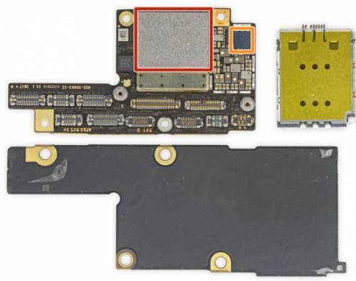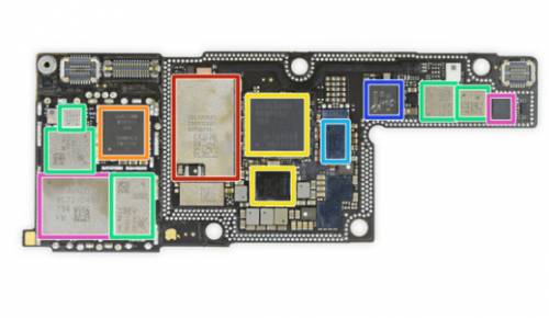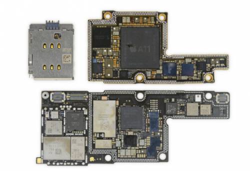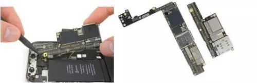 苹果为了在尺寸有限的主板上投入更多的技术,将主板折成了两半,两个部分是焊接在一起的,需要将它们分离开来。将两层主板分离之后发现,对比 iPhone 8 Plus 的主板来说,总面积增大了 35%,但双层堆叠的设计缩小了空间占用面积。然而这个聪明的设计的缺点是板级修复将非常困难(在某些情况下几乎不可能修复)。