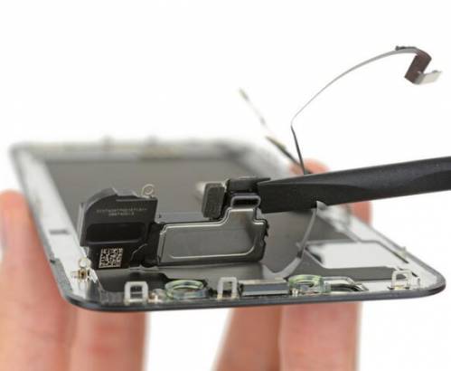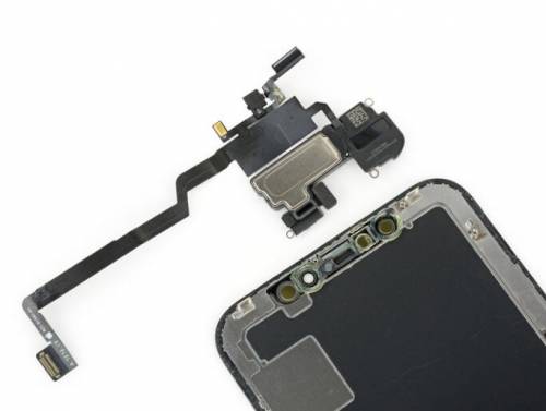 小心将组件拆卸下来之后,我们可以看到扬声器、麦克风、环境光传感器、距离传感器等等。