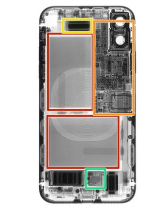 屏幕面板和机身分离之后,可以看到这款机型的硬件。通过X光扫描发现,刚刚那个神秘芯片被安装在显示屏幕上。另外,我们可以看到iPhone X采用的是双电池和较小的逻辑板。