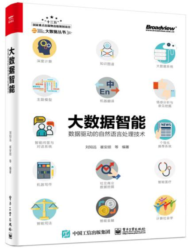 本书基础部分有3章。第1章以深度学习为例介绍大数据智能的计算框架;第2章以知识图谱为例介绍大数据智能的知识库;第3章介绍大数据的计算处理系统。在大数据智能的技术和应用部分,我们选择文本大数据作为主要场景进行介绍,主要原因在于,语言是人类智能的集中体现,语言理解也是人工智能的终极目标,图灵测试的设置是以语言作为媒介的。技术部分有6章,分别介绍主题模型、机器翻译、情感分析与意见挖掘、智能问答与对话系统、个性化推荐系统、机器写作等数据智能关键技术。应用部分有5章,分别介绍社交商业数据挖掘、智慧医疗、智慧司法、智能金融、计算社会学等典型应用场景。