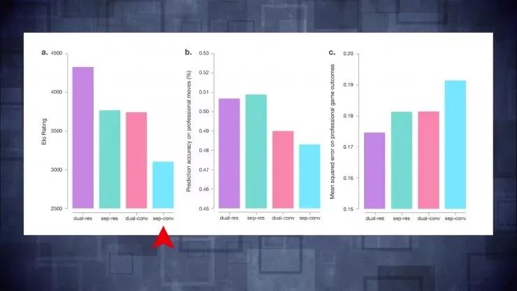 从卷积网络切换到残差网络后,我们可以看到,左图柱状体是残差网络,右边是原始的网络,红色柱体是利用卷积神经网络组合评价函数和策略向量的结果。切换成残差网络后得到了很大提升,把原始论文中的卷积神经网络切换成残差网络之后也会得到同样的提升。同时组合评价函数和对策向量,我们可以看到紫色的柱状体,这也是最终系统的性能结果。