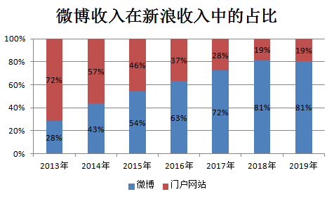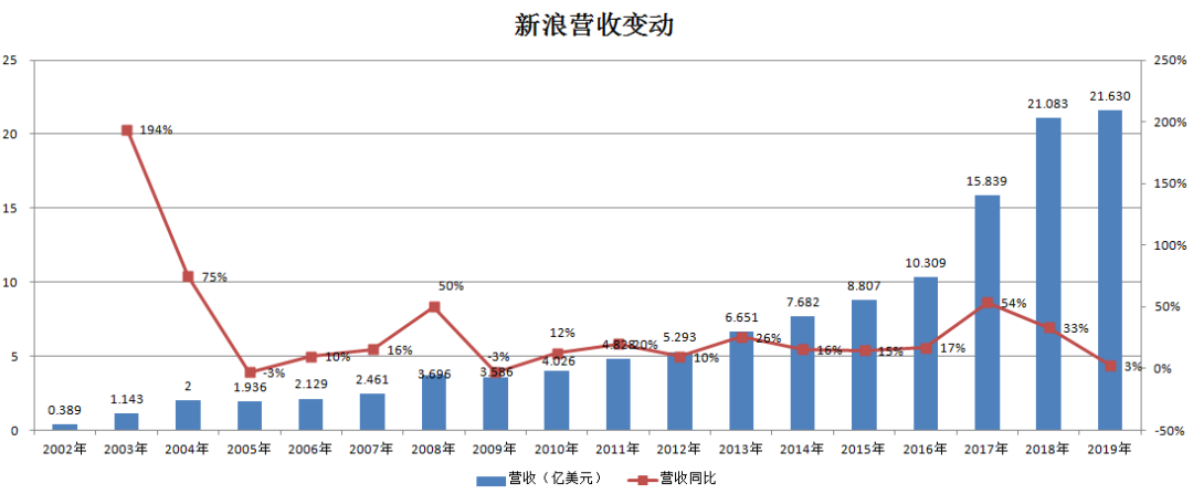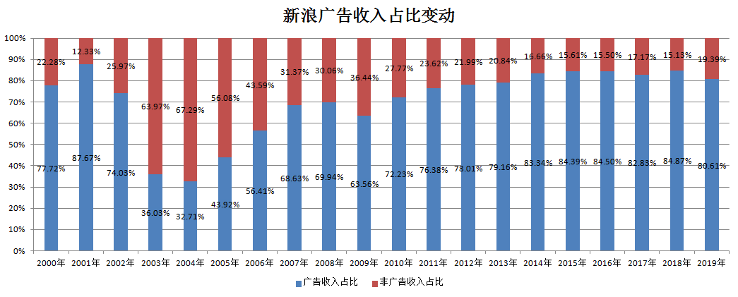 在过去的20年里,新浪从门户起家、靠微博业务立足,但即便成功完成从门户向微博转型,新浪的变现方式没变——广告收入常年占据着它50%以上的营收来源,近6年则升至80%以上。
