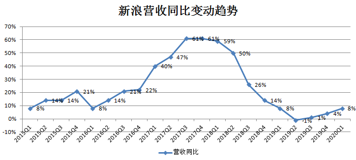 不过,新浪的广告业务增速已经放缓,这或许直接影响到了新浪的业绩。观察新浪历年财报,自2017年,其广告收入同比增幅持续加速下降。其营收同比增幅也自2018年Q1连续6个季度同比下降,直到去年Q3才略有起色。公司归属于新浪股东的净利润同比增幅于2016年Q3达到顶峰后,一直呈下降态势。