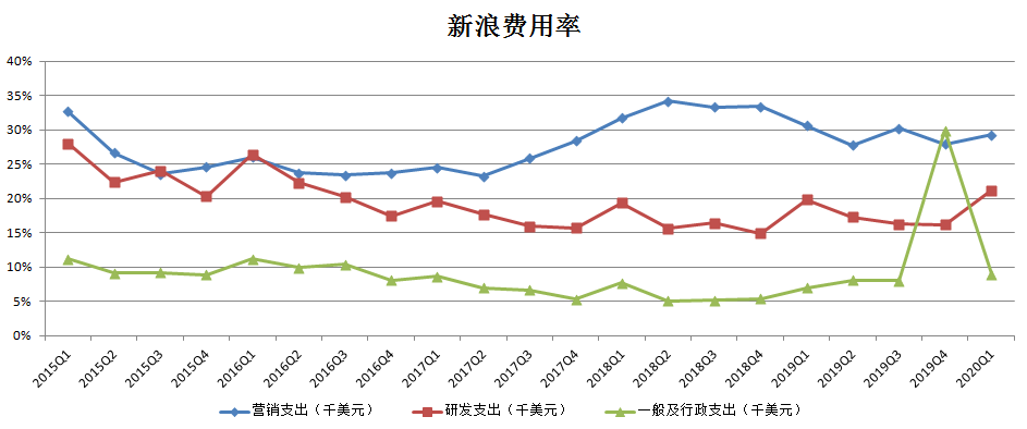 新浪的三大费用支出中,研发费用率自2016年Q2开始一直低于营销费用率。同时,自2018年Q1起,其研发支出同比增幅总体呈下降态势。