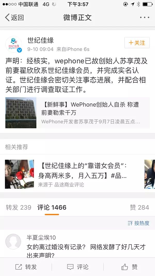 9月7号凌晨3点46分,在自己研发的产品WePhone推送了一条“公司法人被毒妻翟某害死,WePhone即将停止运营”的消息后,凌晨4点多,37岁的苏享茂从西二旗的家中跳楼自杀。