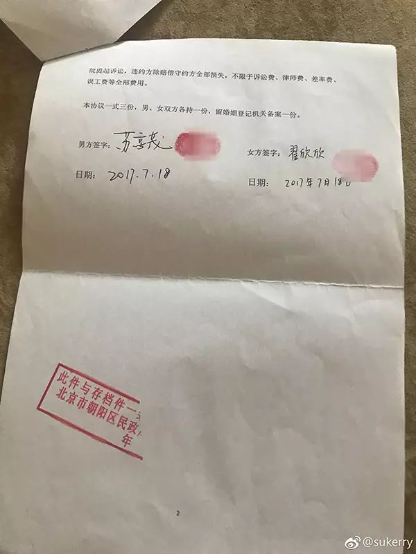 网传苏享茂和翟某欣的离婚协议书。 微博@sukerry 图