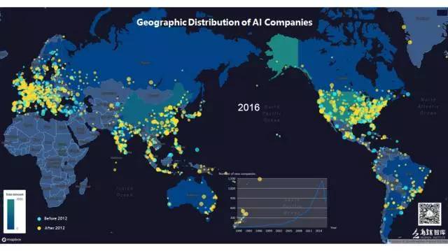 情况到了2016年,有了颠覆性的变化,人工智能迎来井喷式增长,欧洲地区与美国的企业分布地图被黄点覆盖,其中2011年前建立的AI企业也有相当数量。而此时的中国同样具有了不俗的规模,在沿海地区大量增加的AI企业形成了规模化的集群,共同促进地区发展,中国有着自己的一派发展规律。