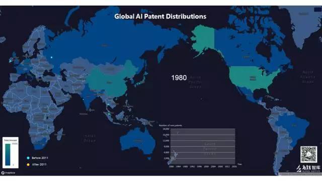 观察1980年与2016年的全球AI专利分布图,我们可以发现美国、中国、欧洲俨然为专利大户,与企业分布地图所展现的一样,在这些领域内,工业界的大规模迸发,激发了人们对于AI科技的探索。