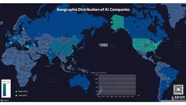 观察1990年的全球AI企业地理分布,我们可以看到,欧洲与美国的AI企业数量较多,此时的中国尚未加入到人工智能竞争的行列中,但也有了早期萌芽。