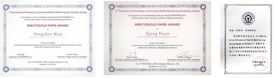 上述发展的SH波换能器已经在美国Tufts大学,北京理工大学,厦门大学、大连理工大学等单位得到了应用,反响很好。相关工作先后获得了第一届和第二届轨道交通结构健康监测国际研讨会一等奖(2016,2018,均唯一)、中国铁道学会最佳论文一等奖(2019)等奖项。