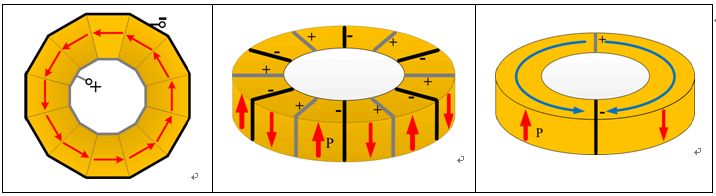 图4. 第三代:全向型SH波压电换能器:(左)基于12片d24型压电片;(中)基于厚度极化d15型压电圆环12等分;(右)基于厚度极化d15型双半圆环