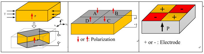图2. 第一代:面内剪切d36型压电换能器(左),及合成d36型换能器(中)通过二维反向极化;(右)通过二维反向电场