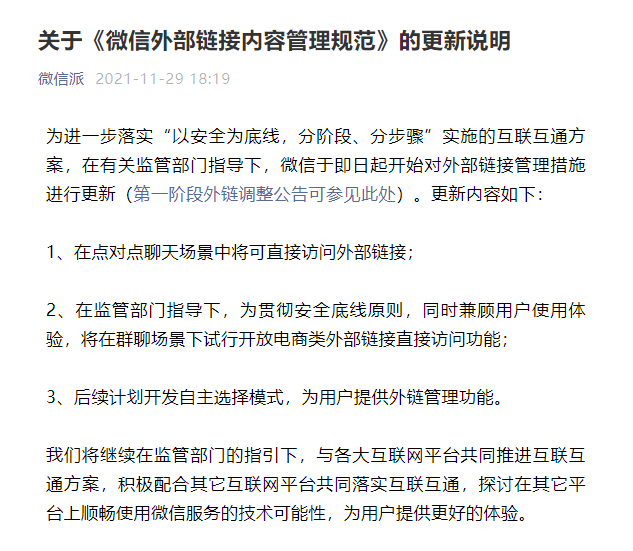 《微信外部链接内容管理规范》昨晚正式发布,表示为了能与各大互联网平台共同推进互联互通方案,将在监管部门指导下,在点对点聊天场景中将可直接访问外部链接,还将在群聊场景下试行开放电商类外部链接直接访问功能。除此之外,后续计划开发自主选择模式,为用户提供外链管理功能。