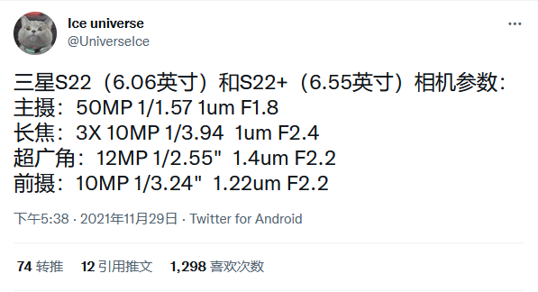数码博主 @i冰宇宙 今日在推特分享了 Galaxy S22 和 Galaxy S22+ 的相机规格参数。在推文中表示,Galaxy S22 会配备 6.06 英寸的屏幕,而 Galaxy S22+ 会配备 6.55 英寸的屏幕,两者的相机规格参数完全相同。