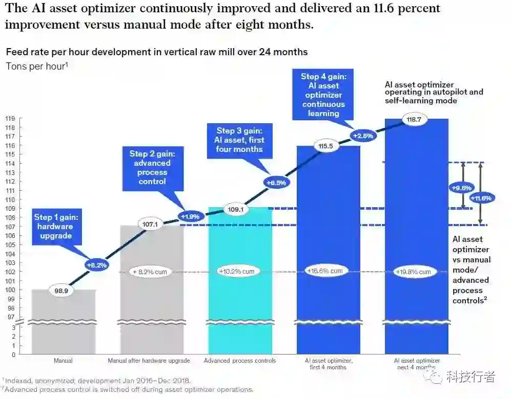 麦肯锡发现,人工智能可以自动执行某些复杂的任务,并提供一致性和精确的最佳设定点,让设备能够自动运行,这对于采取一班制或者多班制的自动化制造来说至关重要。(资料来源:麦肯锡,《生产中的人工智能:重型资产制造企业的重大变革》,作者Eleftherios Charalambous、Robert Feldmann、GérardRichter和Christoph Schmitz)