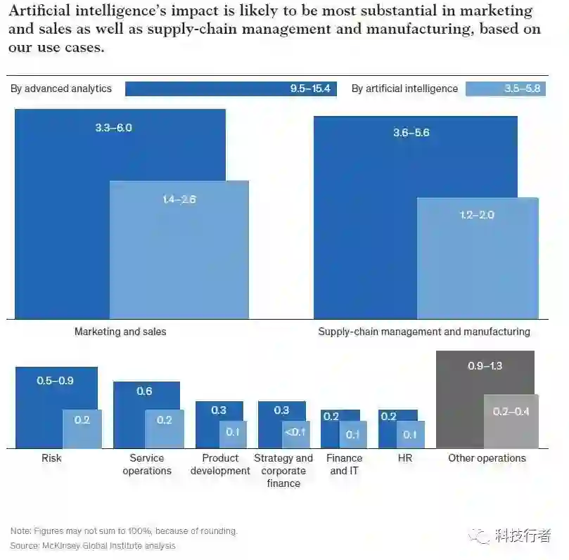 据统计预测,人工智能将给全球企业的市场营销和销售创造1.4万亿美元到2.6万亿美元的价值,给供应链管理和制造创造1.2万亿到2万亿美元的价值。对此,麦肯锡也预测,基于人工智能的预测性维护可能会给制造企业带来0.5万亿美元到0.7万亿美元的价值。