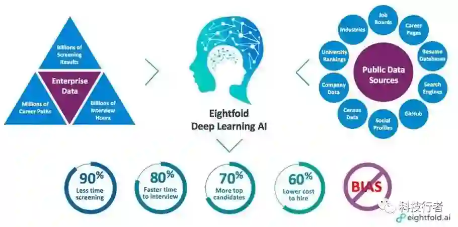 举个例子,一家名为Eightfold的公司,他们打造了一个基于人工智能的Talent Intelligence Platform平台,该平台依赖于一系列监督和无监督的机器学习算法来匹配候选人独有的能力、经验和优势。除此之外,包括ConAgra等在内的许多制造企业也都采用了Eightfold的平台来改善招聘,发现他们配备团队和实现增长所需的人才。下图解释了Eightfold人才智能平台的工作原理: