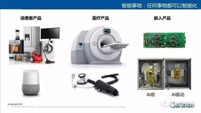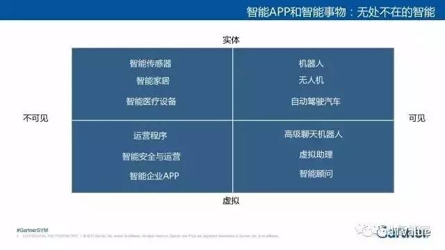“应用人工智能和高级机器学习带来了一系列智能实现,包括物理设备(机器人,自动车辆,消费电子)以及应用和服务(虚拟个人助理(VPA),智能顾问)”。这些实现将表现为新一类的智能应用和物件,以及为广泛的网格设备和现有的软件和服务解决方案提供嵌入式智能。