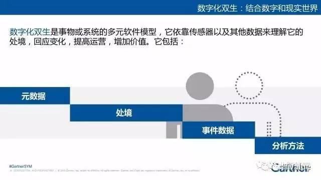 在三到五年内,数以亿计的物件将由数字化双生的形式呈现。组织将使用数字化双生主动修复和规划设备服务、规划制造流程、操作工厂、预测设备故障或提高运营效率,以及执行增强的产品开发。因此,数字化双生最终将成为技术人员和传统监测设备和控制(例如,压力计,压力阀)的组合的代理。