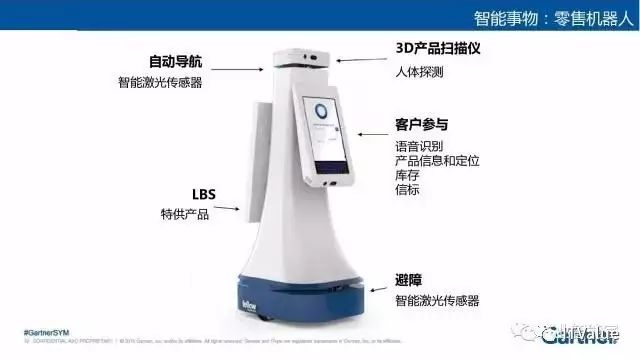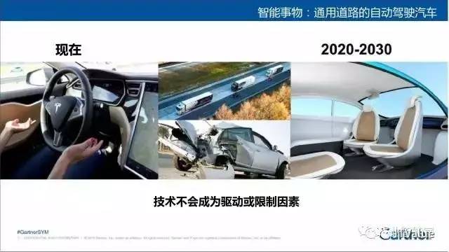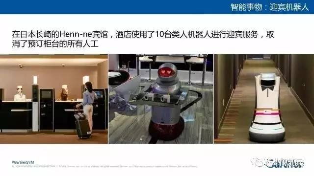 智能事物的预测,就是认为在可以预期的未来,任何事物都可以智能化,比如消费者产品、医疗产品、嵌入式产品等等。但这个预测已经滞后了,现在已经有这方面的产品,甚至都具备了可用性。比如Google、Uber研发的应用在通用道路的自动车辆;运用在特定环境的自动驾驶汽车:如无人收割机等;以及各种各样的机器人,比如零售机器人、迎宾机器人等等。