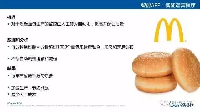 麦当劳生产汉堡包运用了智能App,对汉堡包面包生产的监控由人工专为自动化,能够提高并保证质量。智能应用还拥有数据和分析的优势,如,每分钟通过照片分析超过1000个面包来检查颜色、形态和芝麻分布,并根据分析结果不断自动调整烤箱和流程,以保证生产最好的汉堡包面包。其带来的结果显而易见:避免了浪费,每年节省数千万元;加速生产并节约能源;减少人工成本。