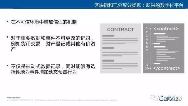 该趋势预测的要点就是在不可信环境中增加信任的机制,对于重要数据和事件不可更改的记录,例如货币交易、财产登记或其他有价资产,不仅是被动式数据记录,同时能够有选择性的为事件增加动态预置行为。