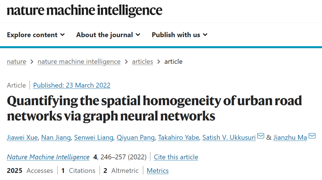 日前,北京大学人工智能研究院马剑竹副教授课题组在Nature Machine Intelligence(NMI)上发表了题为《基于图神经网络的城市道路网空间均匀性量化》(“Quantifying the spatial homogeneity of urban road networks via graph neural networks”)的研究论文。