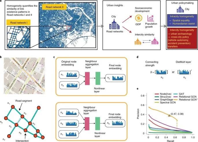 通过量化城市道路网络不同部分的拓扑相似性,人们可以了解城市道路增长模式。尽管传统的统计数据提供了关于单个节点的直接邻居或整个网络特征的有用信息,但此类指标无法衡量子网络的相似性,也无法捕捉局部、间接的邻居关系。为解决这一问题,北京大学马剑竹课题组提出了一种基于图的机器学习方法来量化子网络的空间同质性。课题组成员将该方法应用于全球30个城市的11790个城市道路网,以测量每个城市内和不同城市之间道路网的空间同质性。课题组发现,城市内部的空间同质性与国内生产总值和人口增长等社会经济地位指标高度相关。此外,通过在不同城市间传递模型获得的城际空间同质性值揭示了起源于欧洲、传递给美国和亚洲城市的城市网络结构的城际相似性。该课题组的方法揭示的社会经济发展和城市间的相似性可以用来理解和传递城市之间的见解。这种方法还使人们能够应对城市政策挑战,包括快速城市化地区的网络规划和地区不平等。