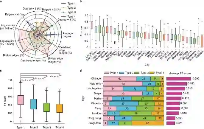 各城市F1成绩的差异可以用道路类型来解释。因此,课题组成员假设一个城市具有很大比例的网格型“瓮型”具有很高的可预测性。为了验证这一假设,课题组成员计算了每个城市的“瓮型”构成。正如预期的那样,一个城市的F1平均分数与网格类型的比例正相关。研究发现URN聚类结果高度一致。