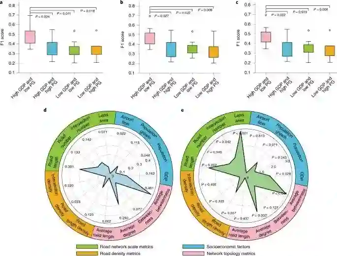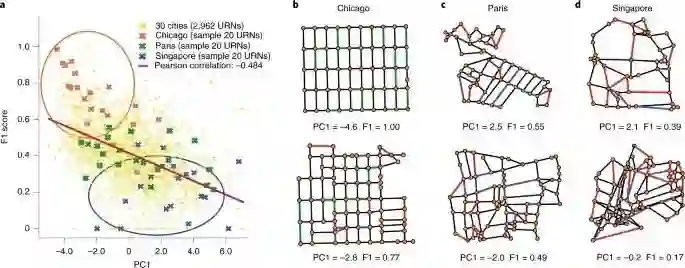 课题组通过计算“链接预测”问题的F1分数(这是机器学习任务中广泛使用的标准预测精度指标,范围在0到1之间),量化了网络的空间同质性,并使用GNN模型根据其两个端点的结构角色预测了链接的存在,即关系图卷积网络(R-GCN)。课题组成员对来自美国、欧洲和亚洲30个城市的11790个URN进行链接预测,并获得了整体的平均F1分数值。