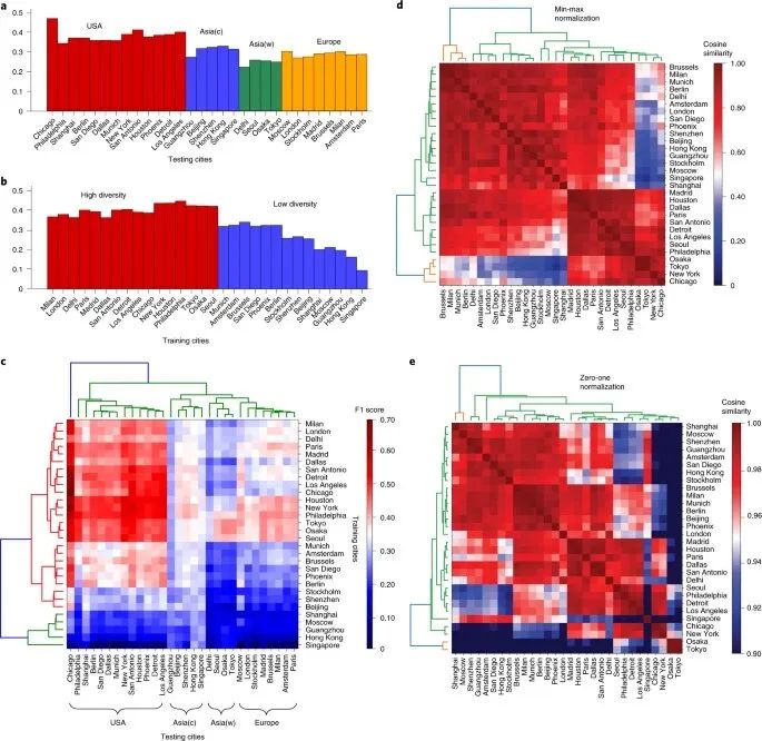 为了计算城市间的URN空间同质性,课题组进行了跨城市链接预测(在城市A上训练GNN模型,并在30个城市的城市B上进行测试),并根据这些城市的平均F1分数作为训练样本和测试样本,对这些城市进行了分层聚类。