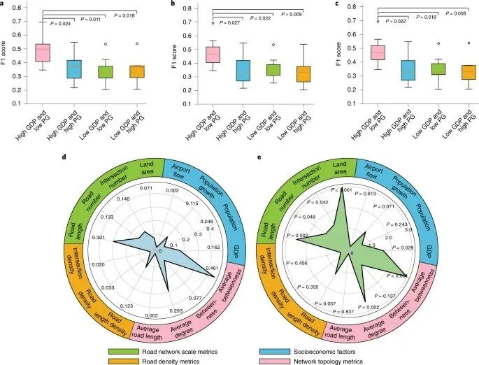 道路网是城市空间的骨架,在经济发展和空间人口集聚的历史过程中不断演变。为了便于理解城市,课题组调查了城市内部空间同质性与社会经济地位指标(如经济、PG和城市年龄)之间的相互作用。课题组根据GDP和PG值将每个城市统一归类为四类,包括高GDP和低PG城市(伦敦、巴黎、纽约、洛杉矶、芝加哥、费城和大阪)。值得注意的是,这些城市都在发达国家,我们称之为成熟城市。这些城市在道路网规划方面投入了更多资金,使其道路网更加标准化和可预测。此外,成熟城市的低PG表明,该城市已经经历了快速PG并进入了稳定期,因此道路网扩张的力量不像以前那么强大,因此更具可预测性。