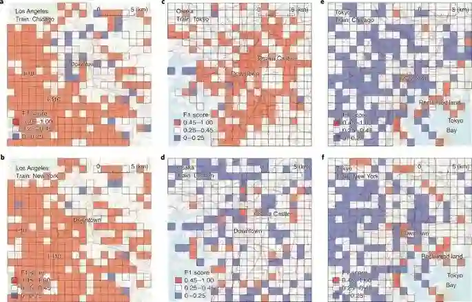 第二个观察结果是,测试方有四个城市群:美国、亚洲(c)、亚洲(w)和欧洲。总的来说,美国类型的城市F1成绩最高,而欧洲类型的城市,都来自欧洲,更难预测。另外两种预测性能较弱的类型是亚洲(c)和亚洲(w)类型。亚洲(c)型城市深受中国文化的影响,而亚洲(w)型城市与西方世界有着积极的联系。美国的城市是有系统地规划和建设的,因此是可预测的,而欧洲和亚洲的城市是由复杂的历史和现代因素同时塑造的。