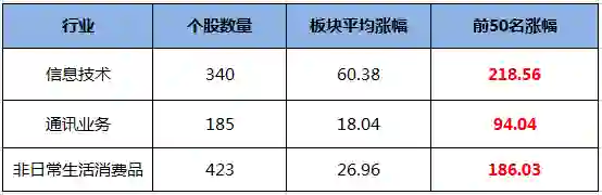 从板块平均涨幅看,涨幅最大的是信息技术,达到60.38%。其余两个板块涨幅一般,还跑输大盘。