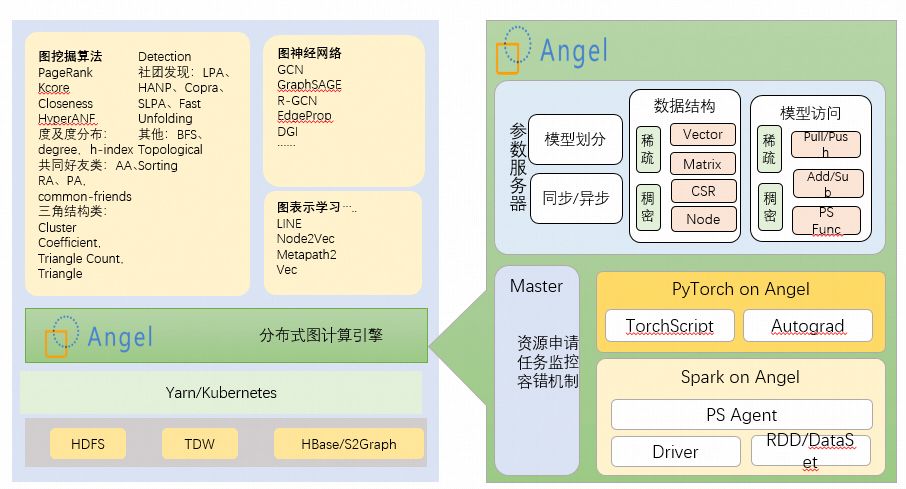 Angel PS:存储模型参数,图结构信息和节点特征等,并且提供模型参数和图相关数据结构的访问接口,例如需要提供两跳邻接访问接口