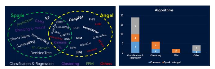 从图9中可以看出,Spark On Angel中的算法与Spark中的算法存在显著的不同,如:基于Spark On Angel的算法主要是针对推荐和图领域,然而Spark中的算法更通用。
