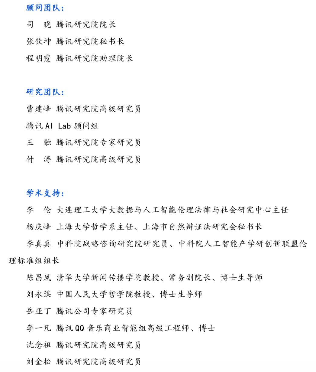 在此背景下,在腾讯研究院过去几年对人工智能伦理进行的持续研究的基础上,腾讯研究院和腾讯AI Lab联合研究形成了这份人工智能伦理报告《智能时代的技术伦理观——重塑数字社会的信任》,认为在“科技向善”理念之下,需要倡导面向人工智能的新的技术伦理观,包含三个层面:技术信任,人工智能等新技术需要价值引导,做到可用、可靠、可知、可控(“四可”);个体幸福,确保人人都有追求数字福祉、幸福工作的权利,在人机共生的智能社会实现个体更自由、智慧、幸福的发展;社会可持续,践行“科技向善”,发挥好人工智能等新技术的巨大“向善”潜力,善用技术塑造健康包容可持续的智慧社会,持续推动经济发展和社会进步。